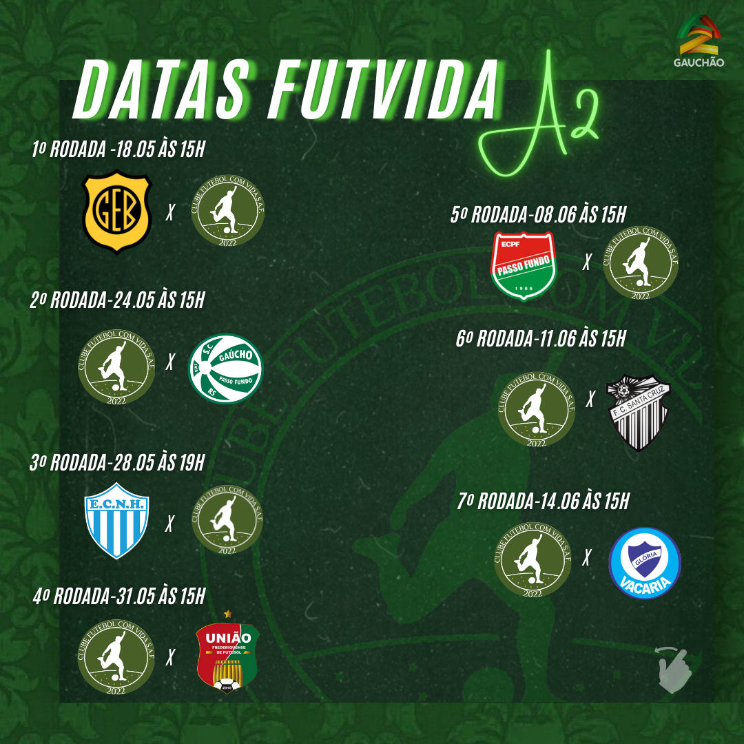 A Federação Gaúcha de Futebol divulgou as datas oficiais da Série A2, e o Futebol com Vida SAF já tem dia e hora para começar a escrever seu próximo capítulo na história do futebol gaúcho. ???? Prepare o coração, vista o manto e marque na agenda: vem aí uma nova jornada em busca do acesso!